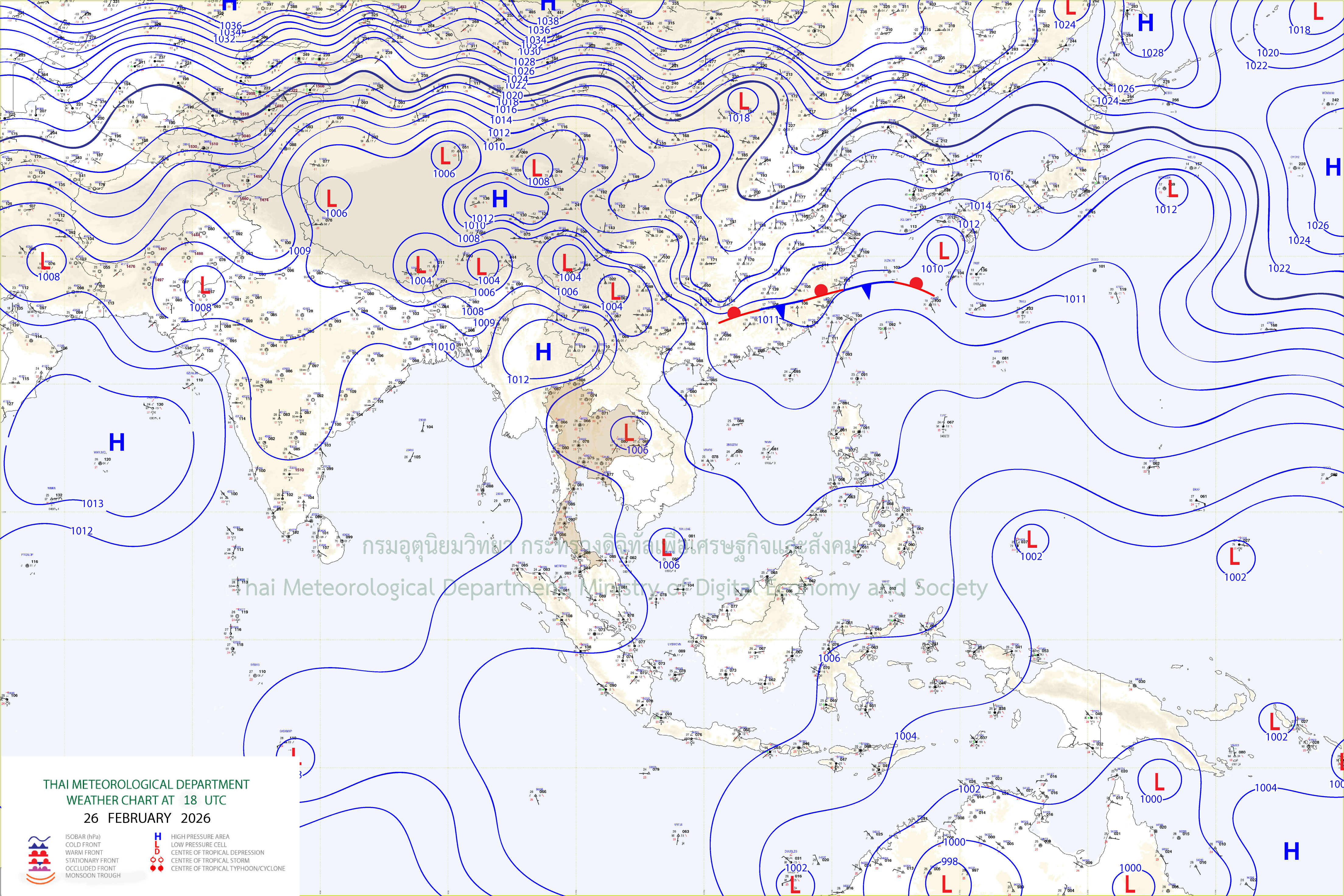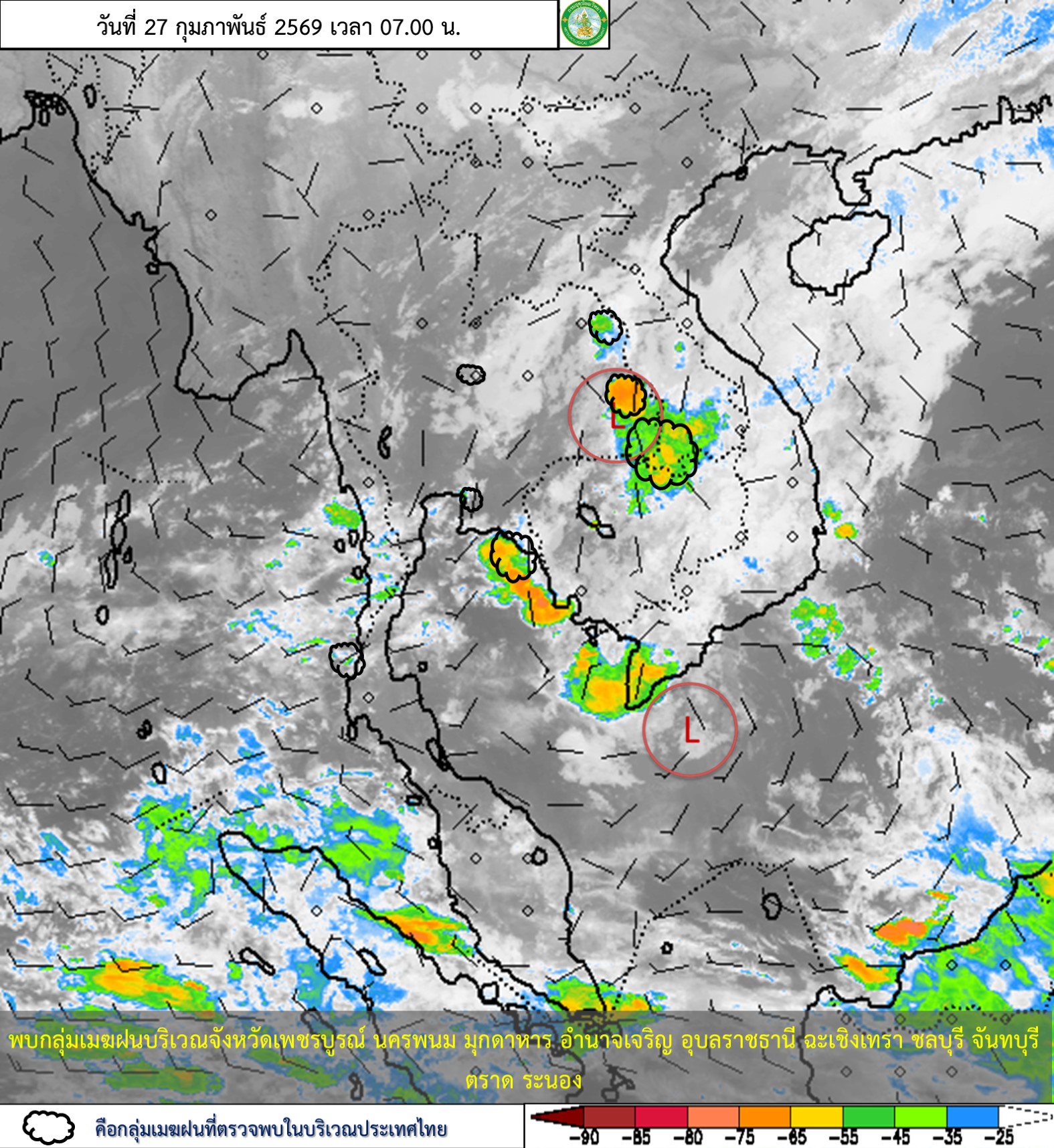 ลักษณะอากาศทั่วไป : ประเทศไทยตอนบนจะมีฝนลดลงกับมีอากาศร้อนขึ้นในตอนกลางวัน แต่ยังมีฝนฟ้าคะนองและลมกระโชกแรงเกิดขึ้นได้บางพื้นที่บริเวณภาคกลางตอนล่าง รวมทั้งกรุงเทพมหานคร ภาคตะวันออก และภาคตะวันออกเฉียงเหนือ เนื่องจากมีลมตะวันตกเฉียงใต้ และลมใต้พัดนำความชื้นเข้ามาปกคลุมบริเวณดังกล่าว ในขณะที่มีลมฝ่ายตะวันตกในระดับบนปกคลุมภาคเหนือ ภาคกลางตอนบน และภาคตะวันออกเฉียงเหนือตอนบน ขอให้ประชาชนบริเวณดังกล่าวระวังอันตรายจากฝนฟ้าคะนองและลมกระโชกแรงที่จะเกิดขึ้น โดยหลีกเลี่ยงการอยู่ในที่โล่งแจ้ง ใต้ต้นไม้ใหญ่สิ่งปลูกสร้าง และป้ายโฆษณาที่ไม่แข็งแรง รวมทั้งดูแลรักษาสุขภาพเนื่องจากสภาพอากาศที่เปลี่ยนแปลงไว้ด้วย