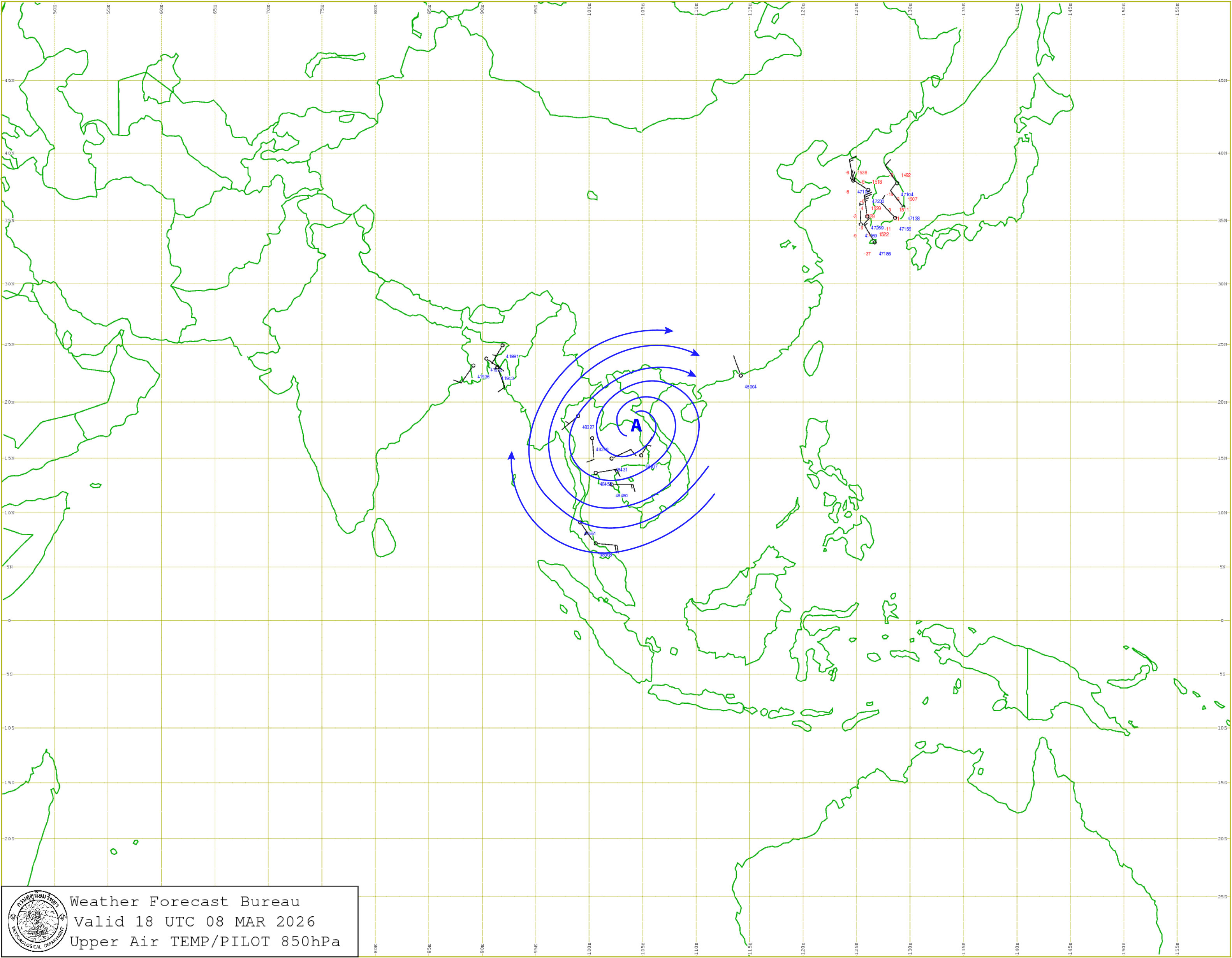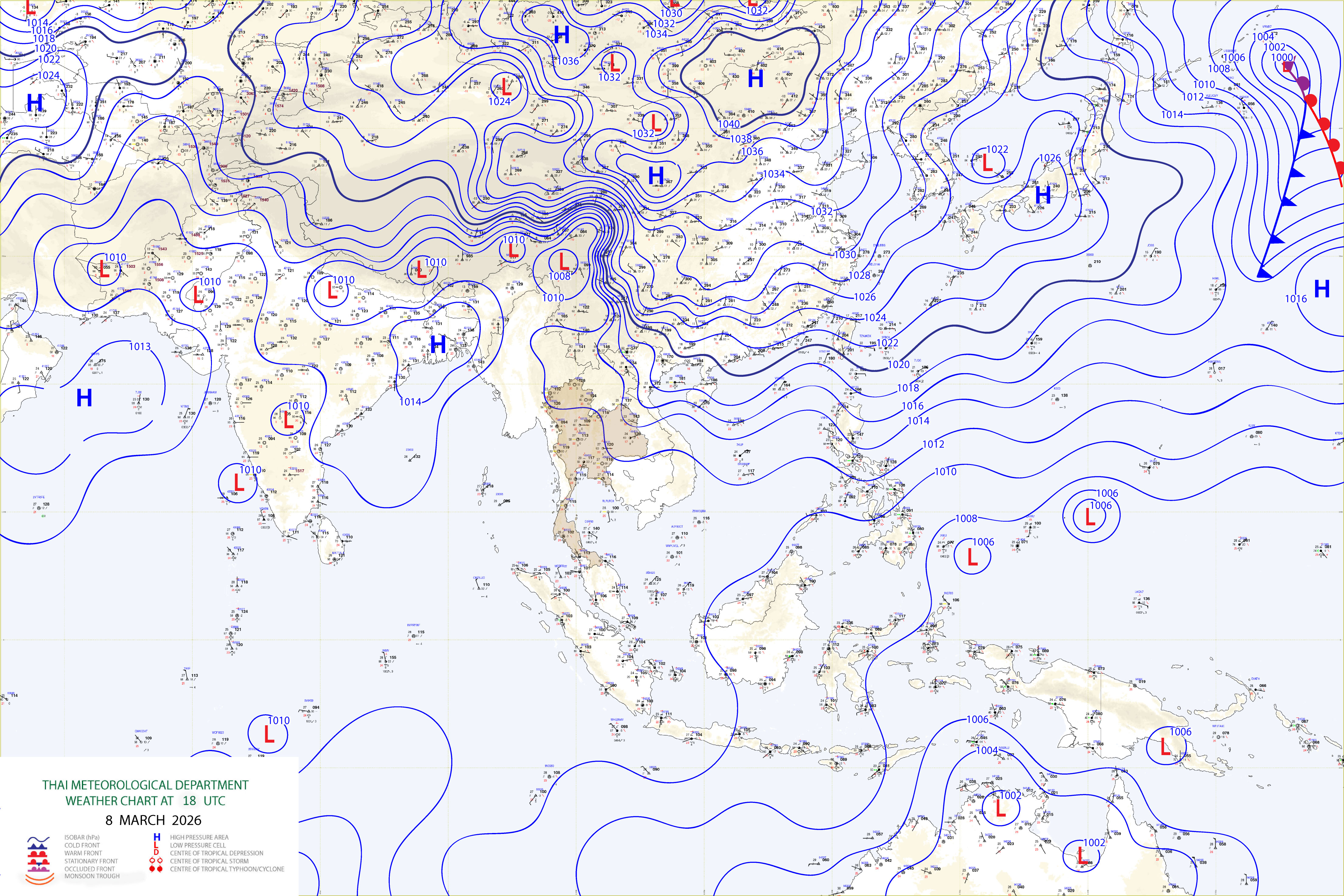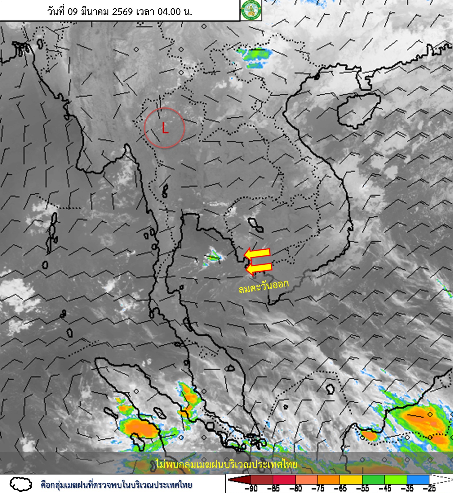 ลักษณะอากาศทั่วไป : พยากรณ์อากาศ 24 ชั่วโมงข้างหน้า ประเทศไทยตอนบนมีอากาศร้อนในตอนกลางวัน แต่ยังคงมีฝนฟ้าคะนองกับลมกระโชกแรงเกิดขึ้นได้บางพื้นที่ เนื่องจากความกดอากาศต่ำเนื่องจากความร้อนปกคลุมประเทศไทยตอนบน ประกอบกับมีลมใต้และลมตะวันออกเฉียงใต้พัดนำความชื้นจากทะเลจีนใต้และอ่าวไทยเข้ามาปกคลุมประเทศไทยตอนบน ในขณะที่ประเทศไทยตอนบนมีอากาศร้อน ขอให้ประชาชนในบริเวณดังกล่าวระวังอันตรายจากฝนฟ้าคะนอง และลมกระโชกแรงไว้ด้วย สำหรับภาคใต้ยังคงมีฝนฟ้าคะนองเกิดขึ้นได้ในระยะนี้ เนื่องจากลมตะวันออกและลมตะวันออกเฉียงใต้พัดปกคลุมอ่าวไทย ภาคใต้ และทะเลอันดามัน โดยบริเวณอ่าวไทยตอนล่างมีคลื่นสูง 1-2 เมตร บริเวณที่มีฝนฟ้าคะนองคลื่นสูงมากกว่า 2 เมตร ขอให้ชาวเรือบริเวณอ่าวไทยและทะเลอันดามันหลีกเลี่ยงการเดินเรือในบริเวณที่มีฝนฟ้าคะนองไว้ด้วย อนึ่ง ในช่วงวันที่ 11-13 มี.ค. 69 บริเวณประเทศไทยตอนบนจะมีพายุฤดูร้อนเกิดขึ้น โดยมีลักษณะของพายุฝนฟ้าคะนอง ลมกระโชกแรง ลูกเห็บตก และฝนตกหนักบางแห่ง รวมถึงฟ้าผ่าที่อาจเกิดขึ้นได้บางพื้นที่ เนื่องจากบริเวณความกดอากาศสูงหรือมวลอากาศเย็นจากประเทศจีนจะแผ่ลงมาปกคลุมภาคเหนือตอนบน ภาคตะวันออกเฉียงเหนือ และทะเลจีนใต้ ส่งผลทำให้มีลมใต้และลมตะวันออกเฉียงใต้พัดนำความชื้นเข้ามาปกคลุมภาคตะวันออกเฉียงเหนือ ภาคกลาง ภาคตะวันออก และอ่าวไทย ในขณะที่ประเทศไทยตอนบนมีอากาศร้อน