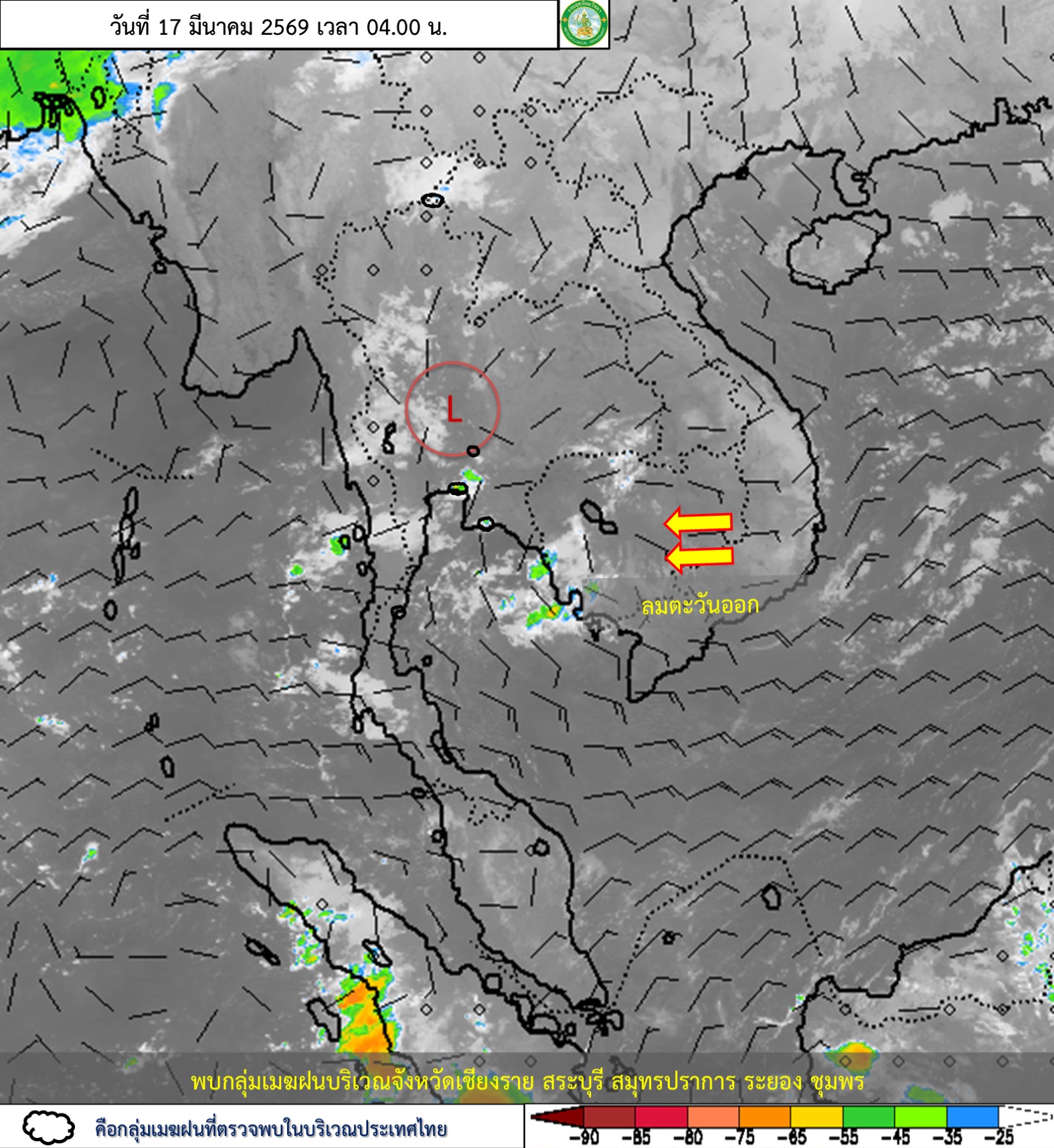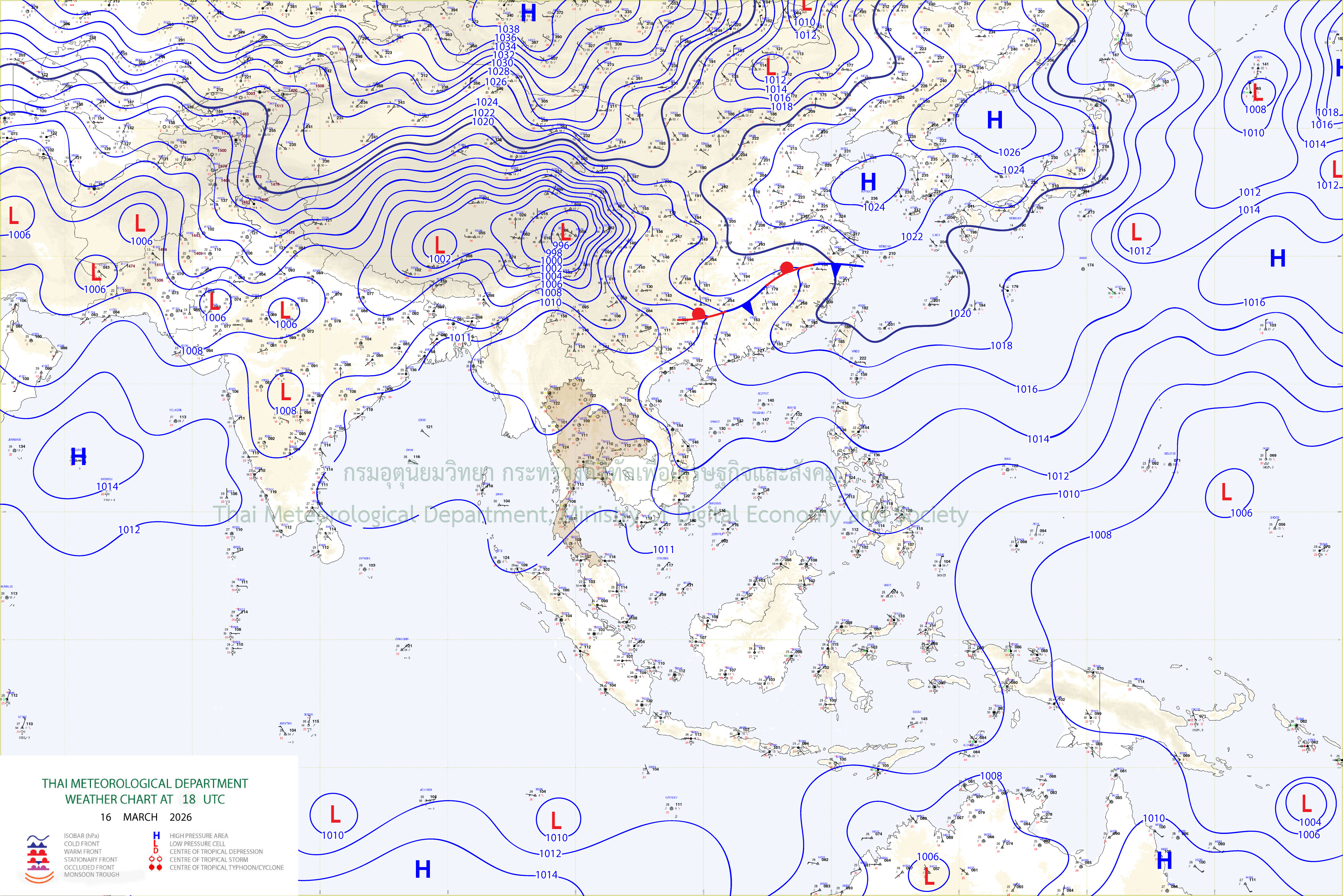 ลักษณะอากาศทั่วไป : พยากรณ์อากาศ 24 ชั่วโมงข้างหน้า ประเทศไทยตอนบนมีอากาศร้อนในตอนกลางวัน แต่ยังคงมีฝนฟ้าคะนองบางแห่ง ส่วนมากบริเวณภาคกลางตอนล่าง และภาคตะวันออก เนื่องจากบริเวณความกดอากาศสูงหรือมวลอากาศเย็นกำลังอ่อนจากประเทศจีนยังคงปกคลุมภาคตะวันออกเฉียงเหนือตอนบน และทะเลจีนใต้ ในขณะที่ลมใต้และลมตะวันออกเฉียงใต้พัดนำความชื้นจากอ่าวไทย และทะเลจีนใต้เข้าปกคลุมประเทศไทยตอนบน ขอให้ประชาชนบริเวณดังกล่าว ระวังอันตรายจากฝนฟ้าคะนอง รวมทั้งดูแลรักษาสุขภาพเนื่องจากสภาพอากาศที่ร้อนขึ้นไว้ด้วย สำหรับภาคใต้มีฝนฟ้าคะนองบางแห่ง เนื่องจากลมตะวันออกพัดปกคลุมอ่าวไทย ภาคใต้ และทะเลอันดามัน ส่วนบริเวณอ่าวไทยตอนล่างมีคลื่นสูง 1-2 เมตร บริเวณที่มีฝนฟ้าคะนองคลื่นสูงมากกว่า 2 เมตร ชาวเรือบริเวณอ่าวไทยและทะเลอันดามันเดินเรือด้วยความระมัดระวัง และหลีกเลี่ยงการเดินเรือในบริเวณที่มีฝนฟ้าคะนองไว้ด้วย