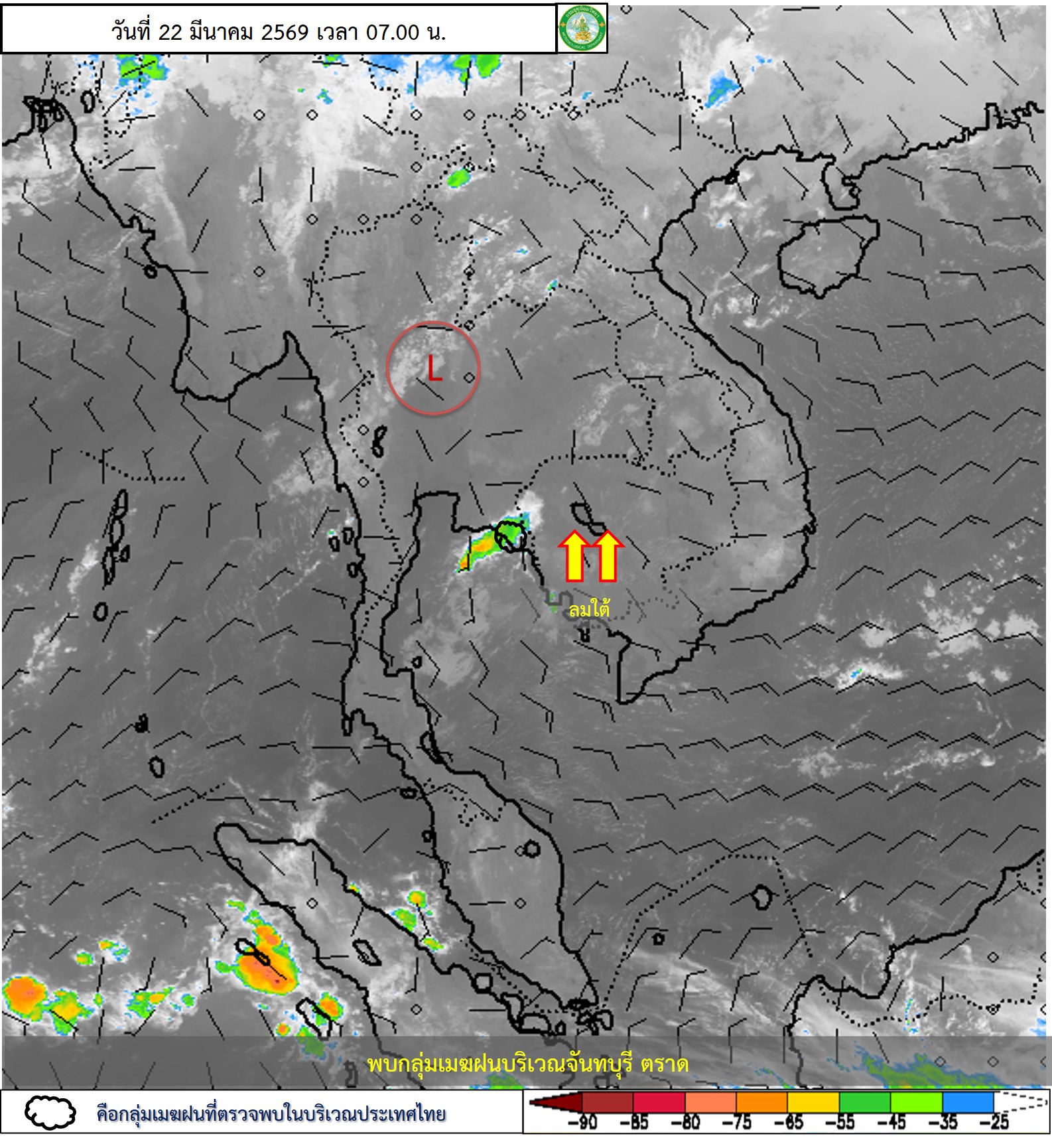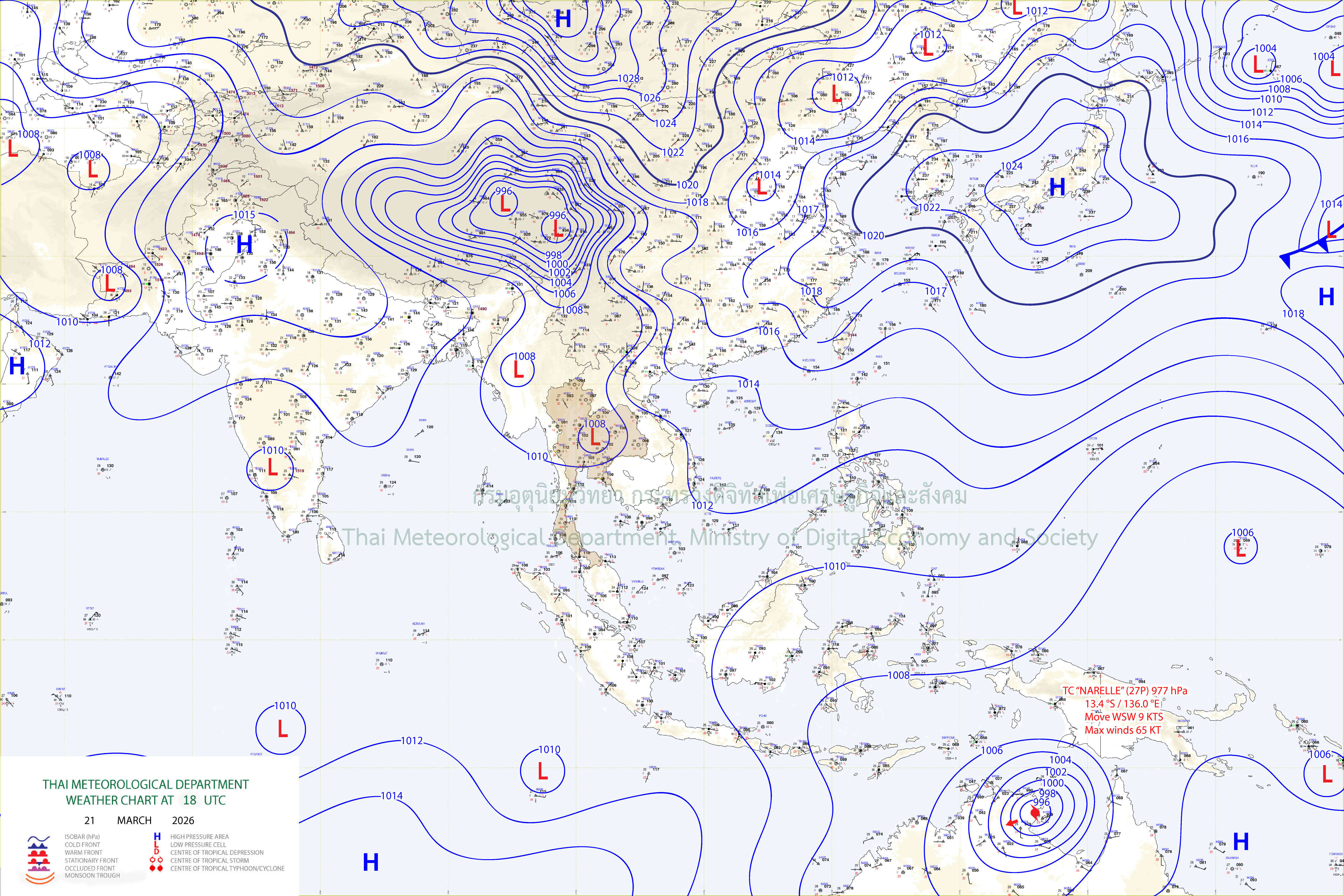 ลักษณะอากาศทั่วไป : พยากรณ์อากาศ 24 ชั่วโมงข้างหน้า ประเทศไทยตอนบนมีอากาศร้อนในตอนกลางวัน โดยมีฝนฟ้าคะนองกับลมกระโชกแรงบางแห่ง เนื่องจากความกดอากาศต่ำเนื่องจากความร้อนปกคลุมประเทศไทยตอนบน ในขณะที่มีลมใต้และลมตะวันออกเฉียงใต้พัดปกคลุมในบริเวณดังกล่าว ขอให้ประชาชนบริเวณประเทศไทยตอนบนดูแลรักษาสุขภาพเนื่องจากสภาพอากาศที่ร้อน และระวังอันตรายจากฝนฟ้าคะนองกับลมกระโชกแรงที่อาจเกิดขึ้นได้ในบางพื้นที่