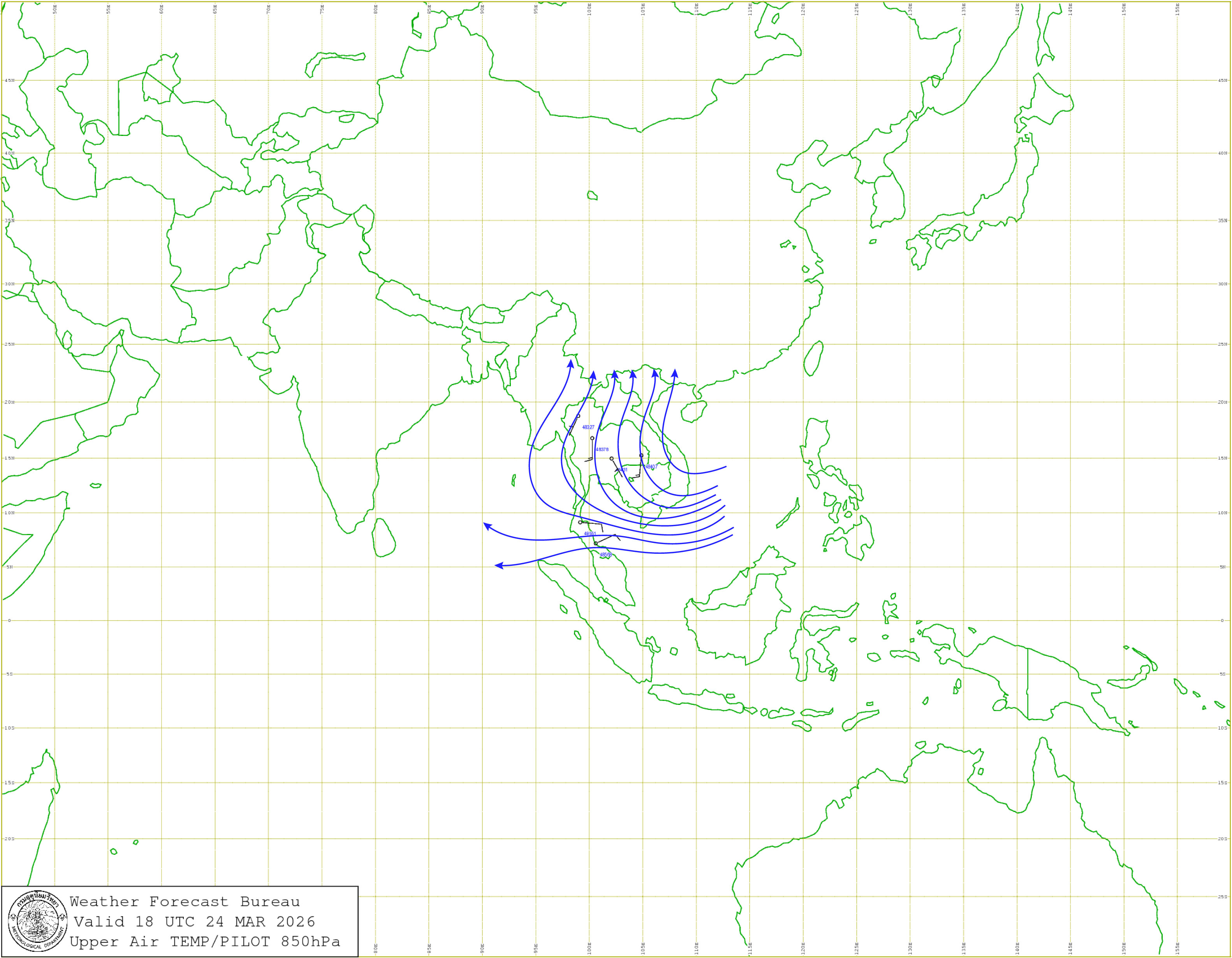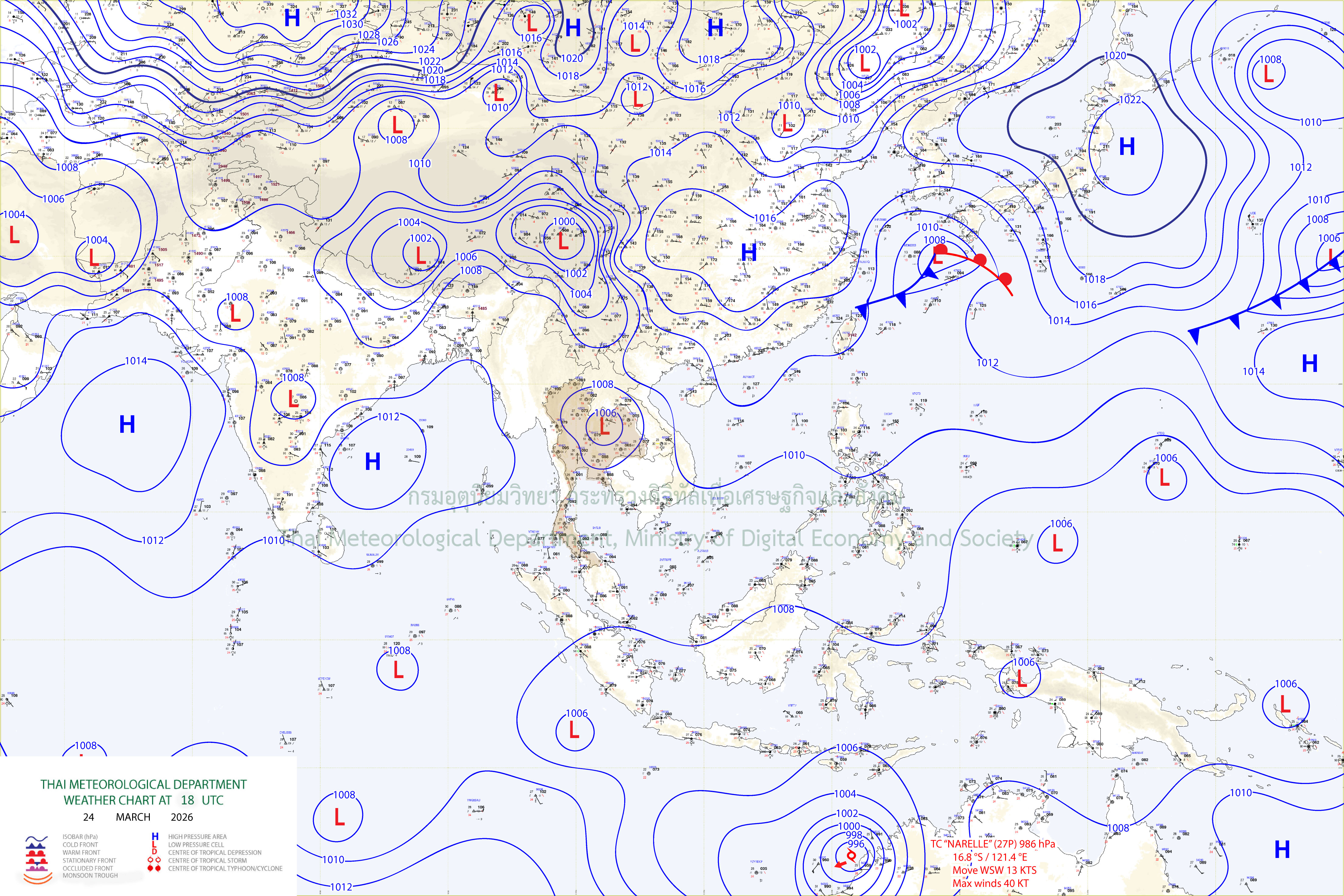 ลักษณะอากาศทั่วไป : พยากรณ์อากาศ 24 ชั่วโมงข้างหน้า ประเทศไทยตอนบนมีอากาศร้อนในตอนกลางวัน และมีอากาศร้อนจัดบางพื้นที่บริเวณภาคเหนือ โดยมีฝนฟ้าคะนองกับลมกระโชกแรงบางแห่ง เนื่องจากความกดอากาศต่ำจากความร้อนปกคลุมประเทศไทยตอนบน ในขณะที่มีลมใต้และลมตะวันออกเฉียงใต้พัดปกคลุมในบริเวณดังกล่าว ขอให้ประชาชนบริเวณประเทศไทยตอนบนดูแลรักษาสุขภาพเนื่องจากสภาพอากาศที่ร้อน และระวังอันตรายจากฝนฟ้าคะนองกับลมกระโชกแรงที่อาจเกิดขึ้นได้ในบางพื้นที่ สำหรับภาคใต้มีฝนน้อย โดยมีอากาศร้อนในตอนกลางวัน เนื่องจากลมตะวันออกและลมตะวันออกเฉียงใต้กำลังอ่อนพัดปกคลุมอ่าวไทย ภาคใต้ และทะเลอันดามัน ส่วนบริเวณอ่าวไทยและทะเลอันดามันมีคลื่นสูงประมาณ 1 เมตร บริเวณที่มีฝนฟ้าคะนองคลื่นสูงมากกว่า 1 เมตร ขอให้ชาวเรือบริเวณอ่าวไทยและทะเลอันดามันหลีกเลี่ยงการเดินเรือในบริเวณที่มีฝนฟ้าคะนองไว้ด้วย