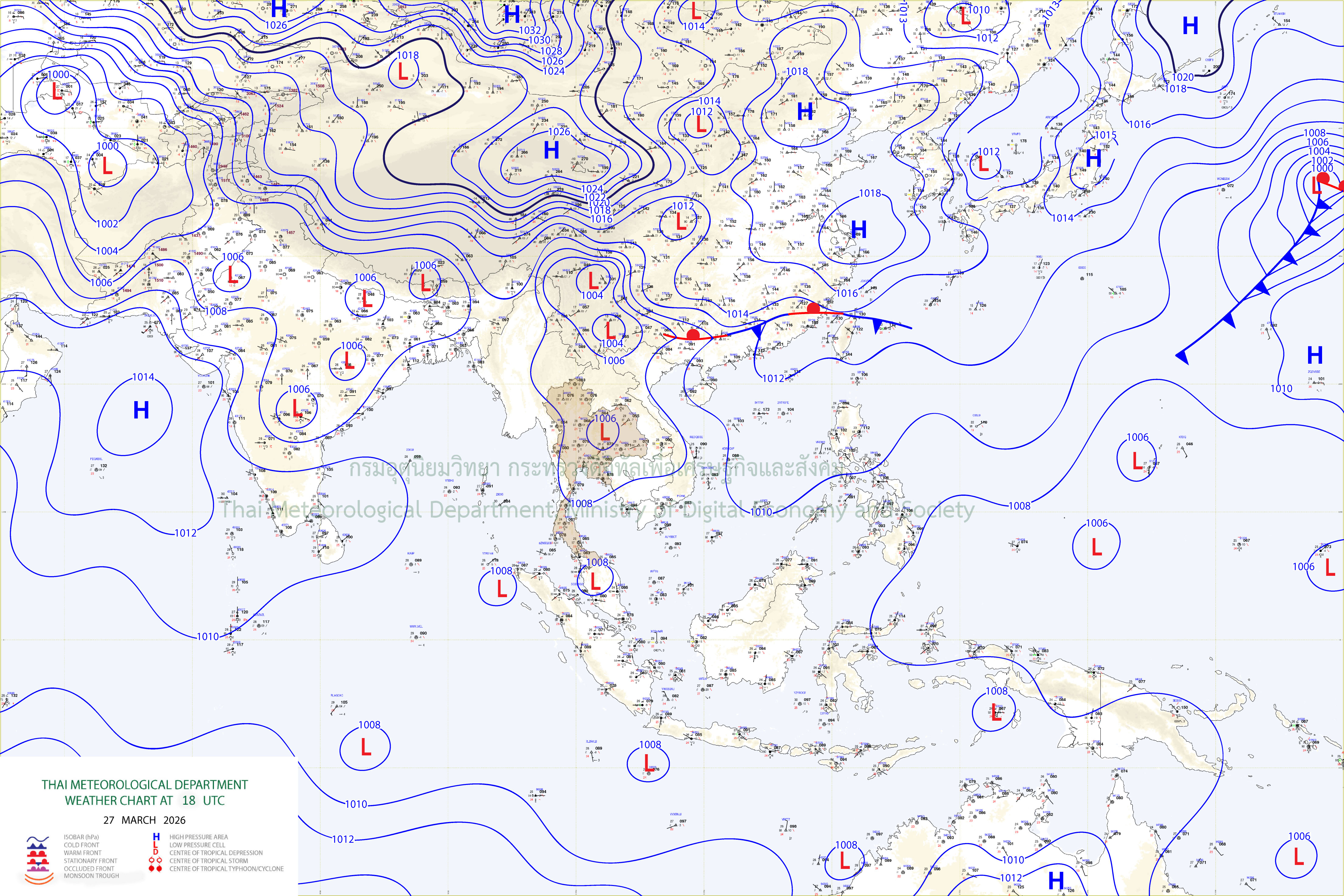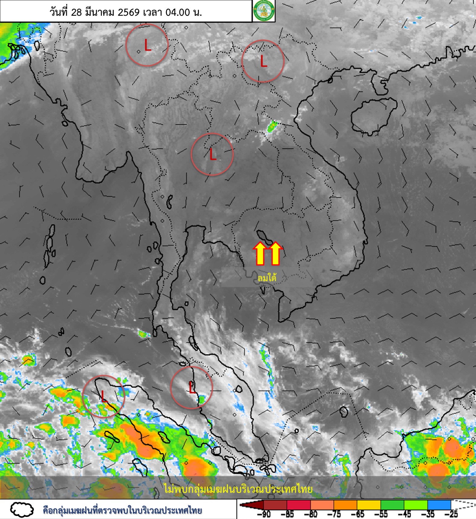 ลักษณะอากาศทั่วไป : พยากรณ์อากาศ 24 ชั่วโมงข้างหน้า ประเทศไทยมีอากาศร้อนโดยทั่วไป กับมีฟ้าหลัวในตอนกลางวัน และมีอากาศร้อนจัดบางพื้นที่ในภาคเหนือ ภาคตะวันออกเฉียงเหนือ และภาคกลาง โดยมีฝนฟ้าคะนองกับมีลมกระโชกแรงบางแห่ง เนื่องจากความกดอากาศต่ำเนื่องจากความร้อนปกคลุมประเทศไทยตอนบน ในขณะที่ลมใต้และลมตะวันออกเฉียงใต้ที่พัดปกคลุมบริเวณดังกล่าวเริ่มมีกำลังแรงขึ้น ขอให้ประชาชนบริเวณประเทศไทยดูแลรักษาสุขภาพเนื่องจากสภาพอากาศที่ร้อนถึงร้อนจัด โดยหลีกเลี่ยงการทำงานหรือการประกอบกิจกรรมในที่โล่งแจ้งเป็นระยะเวลานาน รวมทั้งระวังอันตรายจากฝนฟ้าคะนองและลมกระโชกแรงที่อาจเกิดขึ้นในบางพื้นที่ไว้ด้วย