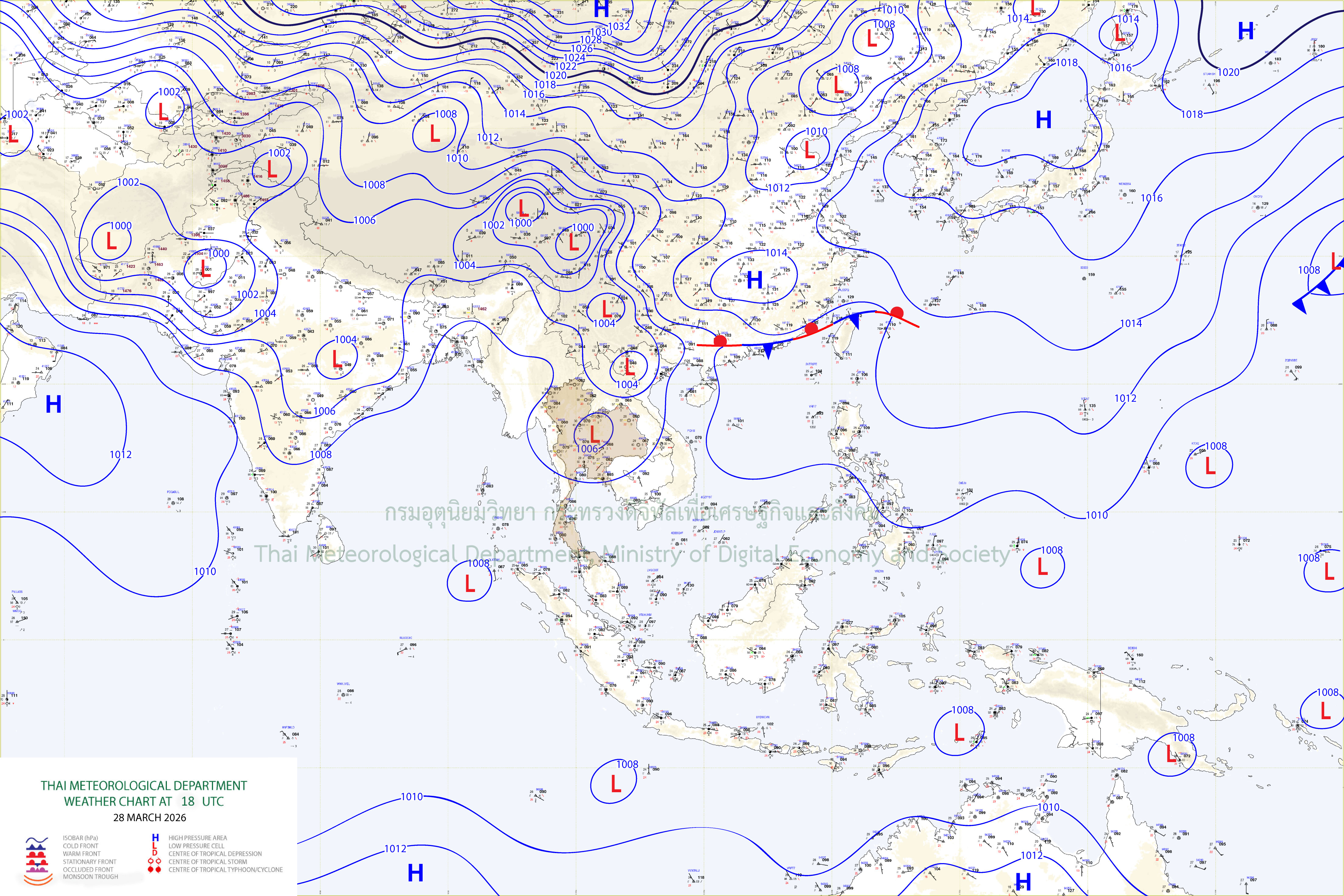 ลักษณะอากาศทั่วไป : พยากรณ์อากาศ 24 ชั่วโมงข้างหน้า ประเทศไทยมีอากาศร้อนโดยทั่วไป กับมีฟ้าหลัวในตอนกลางวัน และมีอากาศร้อนจัดบางพื้นที่ในภาคเหนือ ภาคตะวันออกเฉียงเหนือ และภาคกลาง โดยมีฝนฟ้าคะนองกับมีลมกระโชกแรงบางแห่ง เนื่องจากความกดอากาศต่ำเนื่องจากความร้อนปกคลุมประเทศไทยตอนบน ในขณะที่ลมใต้และลมตะวันออกเฉียงใต้ที่พัดปกคลุมบริเวณดังกล่าวมีกำลังแรงขึ้น ขอให้ประชาชนบริเวณประเทศไทยดูแลรักษาสุขภาพเนื่องจากสภาพอากาศที่ร้อนถึงร้อนจัด โดยหลีกเลี่ยงการทำงานหรือการประกอบกิจกรรมในที่โล่งแจ้งเป็นระยะเวลานาน รวมทั้งระวังอันตรายจากฝนฟ้าคะนองและลมกระโชกแรงที่อาจเกิดขึ้นในบางพื้นที่ไว้ด้วย
