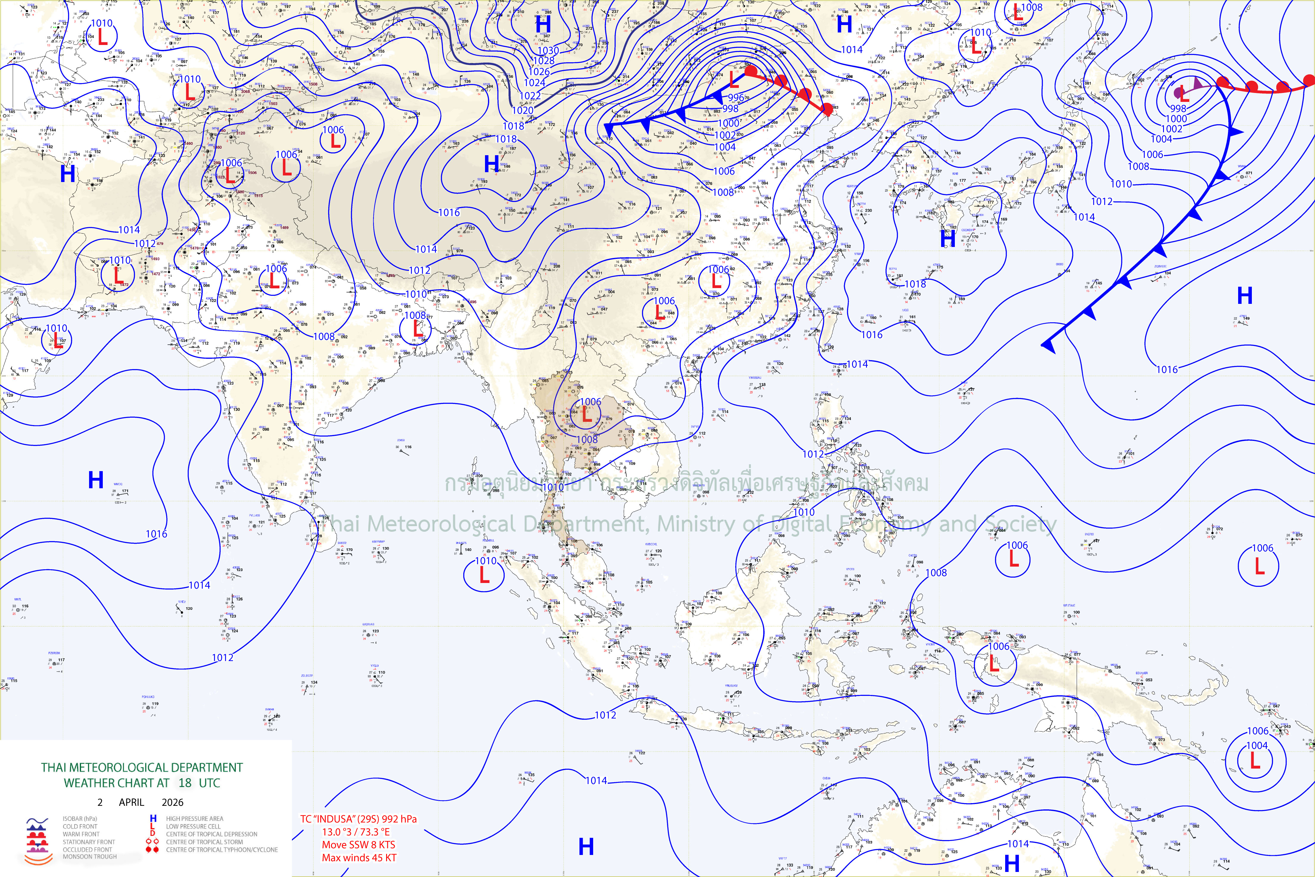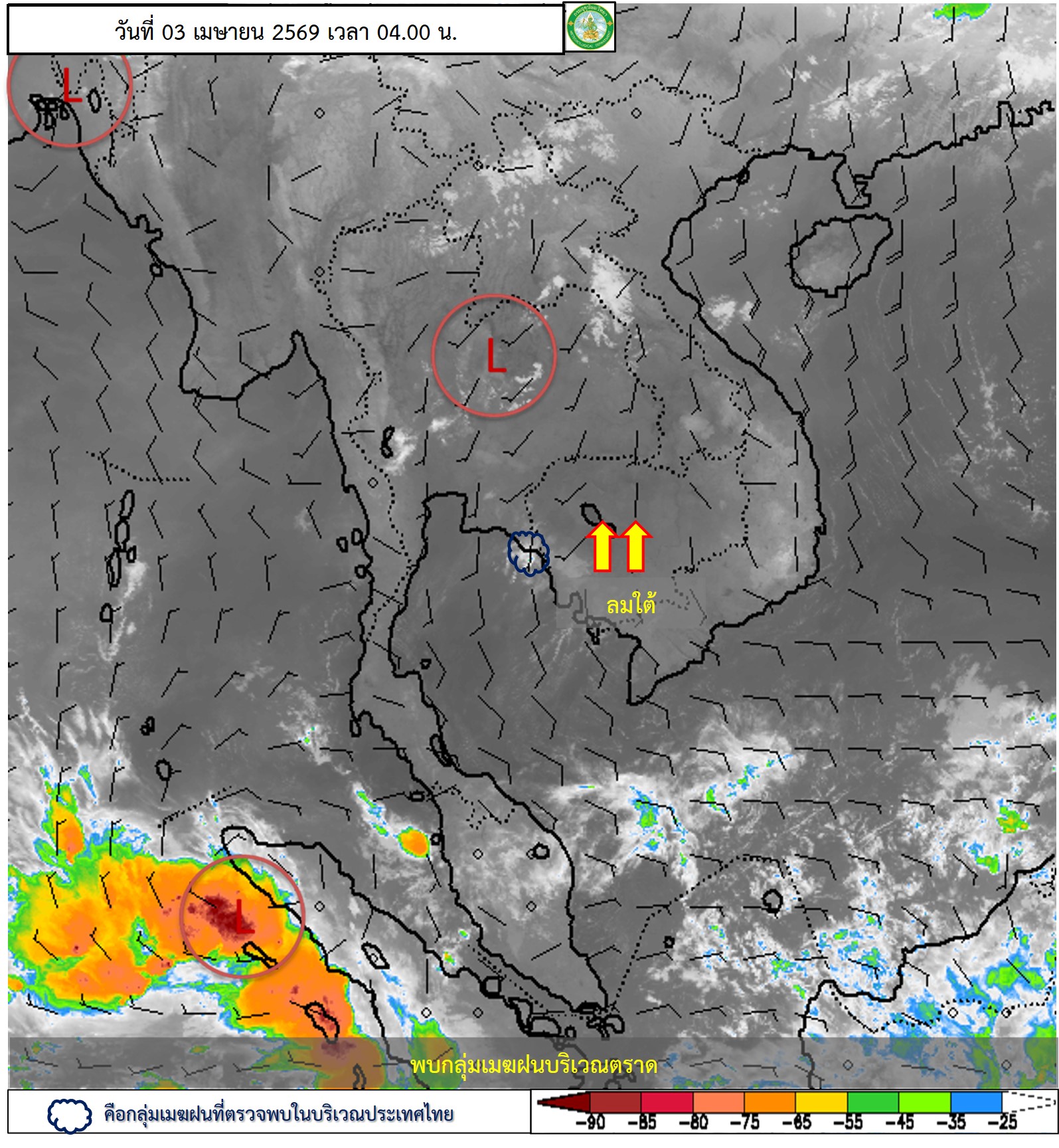 ลักษณะอากาศทั่วไป : พยากรณ์อากาศ 24 ชั่วโมงข้างหน้า ประเทศไทยตอนบนมีอากาศร้อนโดยทั่วไป กับมีฟ้าหลัวในตอนกลางวัน และมีอากาศร้อนจัดบางพื้นที่ในภาคเหนือ ภาคตะวันออกเฉียงเหนือ และภาคกลาง เนื่องจากความกดอากาศต่ำเนื่องจากความร้อนปกคลุมประเทศไทยตอนบน ในขณะที่มีลมใต้และลมตะวันตกเฉียงใต้กำลังอ่อนพัดปกคลุมในบริเวณดังกล่าว ทำให้ประเทศไทยตอนบนยังคงมีฝนฟ้าคะนองเล็กน้อยบางแห่ง ขอให้ประชาชนดูแลรักษาสุขภาพเนื่องจากสภาพอากาศที่ร้อนถึงร้อนจัด โดยหลีกเลี่ยงการทำงานหรือการประกอบกิจกรรมในที่โล่งแจ้งเป็นระยะเวลานาน รวมทั้งระวังอันตรายจากฝนฟ้าคะนองที่อาจเกิดขึ้นในบางพื้นที่ไว้ด้วย สำหรับภาคใต้มีฝนน้อย โดยมีอากาศร้อนในตอนกลางวัน เนื่องจากลมตะวันออกและลมตะวันออกเฉียงใต้ที่พัดปกคลุมอ่าวไทย ภาคใต้ และทะเลอันดามันมีกำลังอ่อน