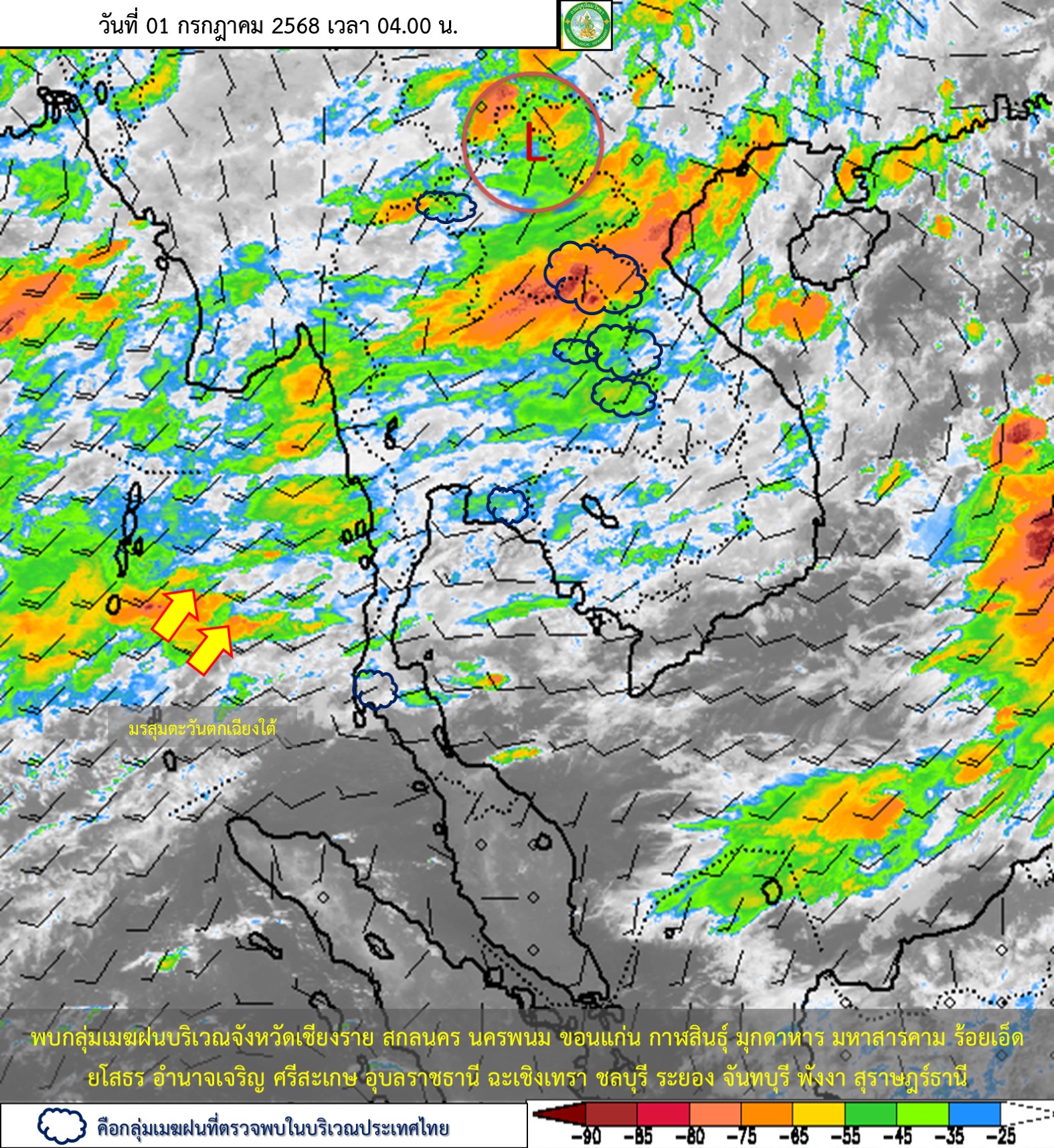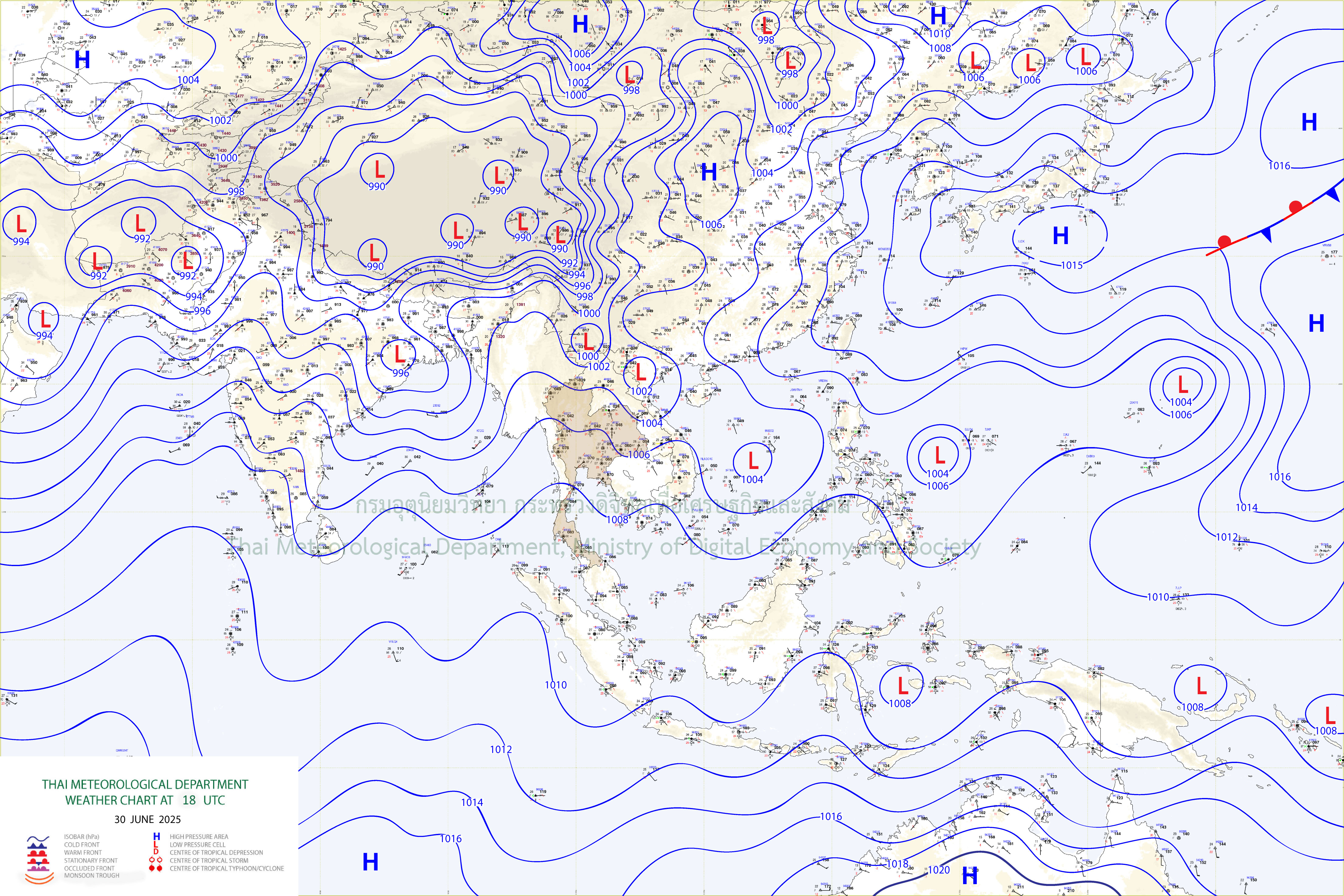ลักษณะอากาศทั่วไป : พยากรณ์อากาศ 24 ชั่วโมงข้างหน้า ประเทศไทยตอนบนมีฝนตกหนักบางแห่งบริเวณภาคเหนือ ภาคตะวันออกเฉียงเหนือ ภาคกลาง และภาคตะวันออก ขอให้ประชาชนบริเวณจังหวัดต่างๆ ตามที่ระบุไว้ในรายภาค ระวังอันตรายจากฝนตกหนักและฝนที่ตกสะสม ส่วนภาคใต้มีฝนฟ้าคะนองบางพื้นที่ ทั้งนี้เนื่องจากมรสุมตะวันตกเฉียงใต้ที่พัดปกคลุมทะเลอันดามัน ประเทศไทย และอ่าวไทยมีกำลังปานกลาง ประกอบกับมีหย่อมความกดอากาศต่ำปกคลุมบริเวณประเทศเวียดนามตอนบน สำหรับคลื่นลมบริเวณทะเลอันดามันและอ่าวไทยมีกำลังปานกลาง โดยทะเลอันดามันตอนบนมีคลื่นสูงประมาณ 2 เมตร ส่วนทะเลอันดามันตอนล่างและอ่าวไทยตอนบนมีคลื่นสูง 1-2 เมตร บริเวณที่มีฝนฟ้าคะนองคลื่นสูงมากกว่า 2 เมตร ขอให้ชาวเรือบริเวณทะเลอันดามันและอ่าวไทยเดินเรือด้วยความระมัดระวังและหลีกเลี่ยงการเดินเรือในบริเวณที่มีฝนฟ้าคะนองไว้ด้วย