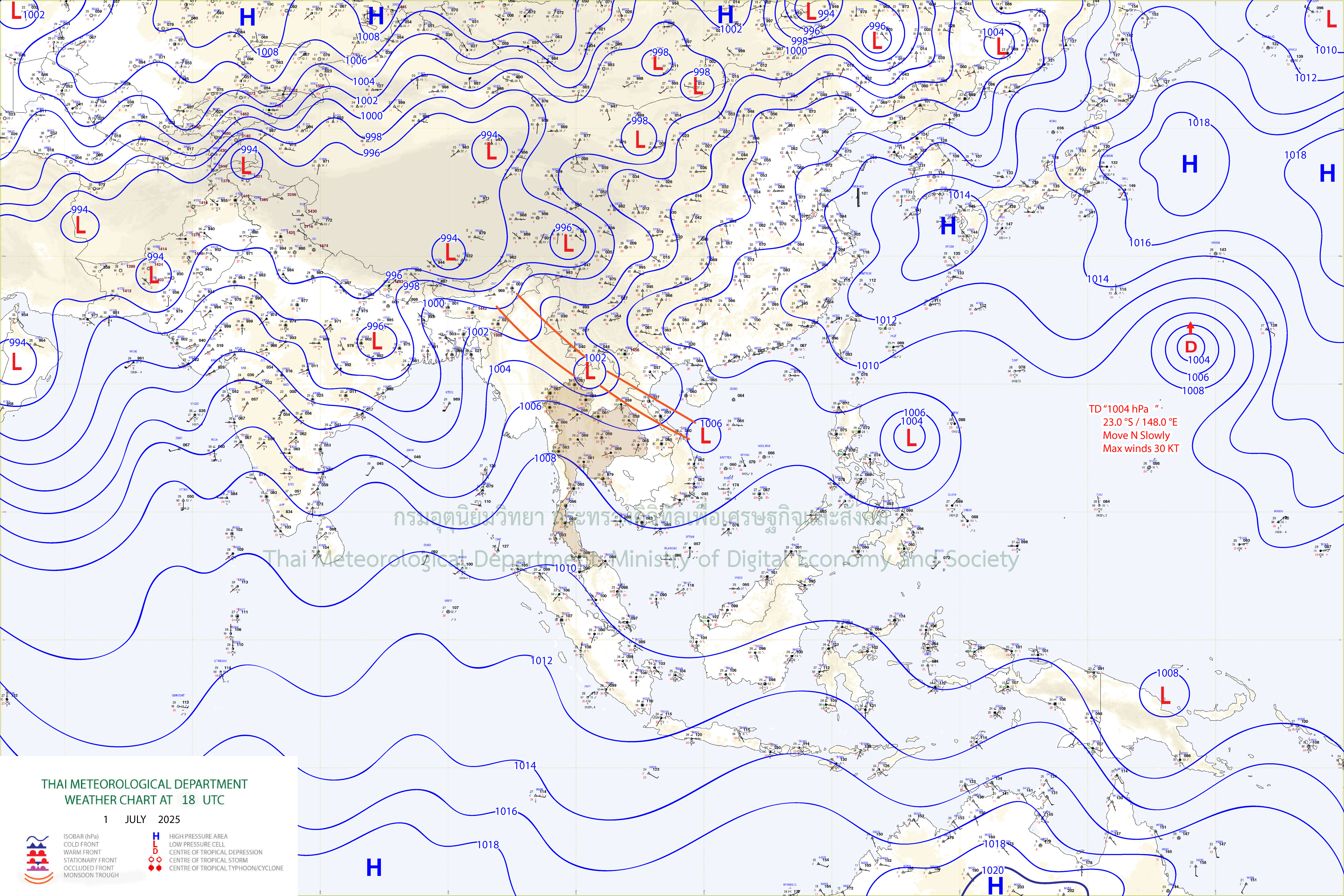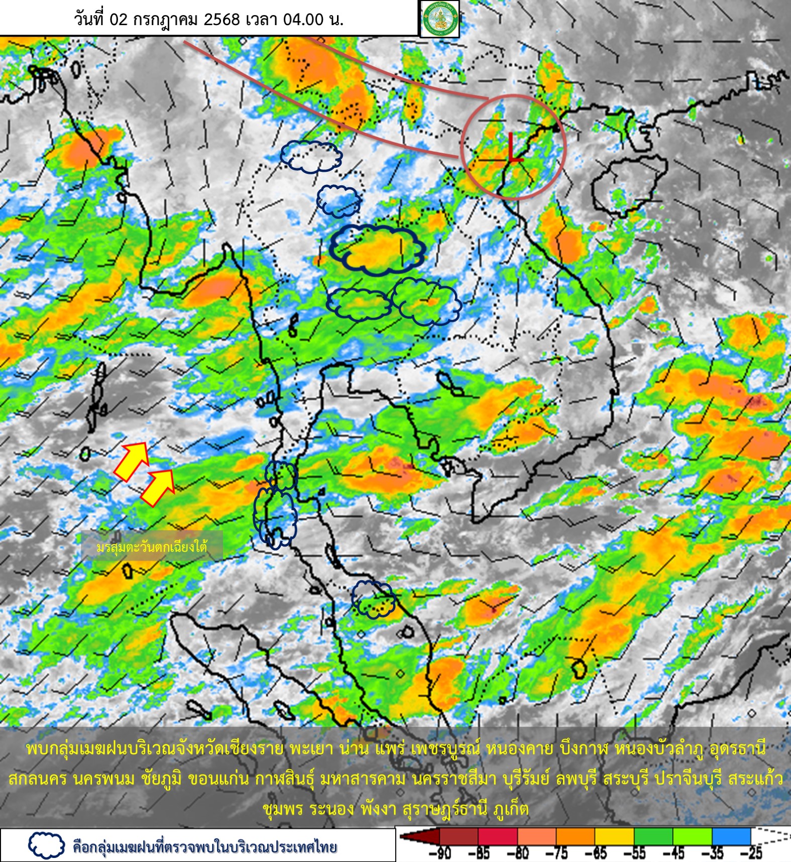 ลักษณะอากาศทั่วไป : พยากรณ์อากาศ 24 ชั่วโมงข้างหน้า ประเทศไทยมีฝนฟ้าคะนอง และมีฝนตกหนักบางแห่ง โดยมีฝนตกหนักมากบางพื้นที่ในภาคเหนือ และภาคตะวันออกเฉียงเหนือตอนบน ขอให้ประชาชนในบริเวณดังกล่าว โดยเฉพาะบริเวณจังหวัดต่างๆ ตามที่ระบุไว้ในรายภาค ระวังอันตรายจากฝนตกหนักถึงหนักมากและฝนที่ตกสะสม ซึ่งอาจทำให้เกิดน้ำท่วมฉับพลัน น้ำป่าไหลหลากและดินโคลนถล่ม โดยเฉพาะพื้นที่ลาดเชิงเขาใกล้ทางน้ำไหลผ่านและพื้นที่ลุ่ม ทั้งนี้เนื่องจากร่องมรสุมกำลังปานกลางพาดผ่านประเทศเมียนมาตอนบน และตอนบนของภาคเหนือ เข้าสู่หย่อมความกดอากาศต่ำบริเวณประเทศลาวตอนบน ประกอบกับมรสุมตะวันตกเฉียงใต้กำลังปานกลางยังคงพัดปกคลุมทะเลอันดามัน ประเทศไทย และอ่าวไทย