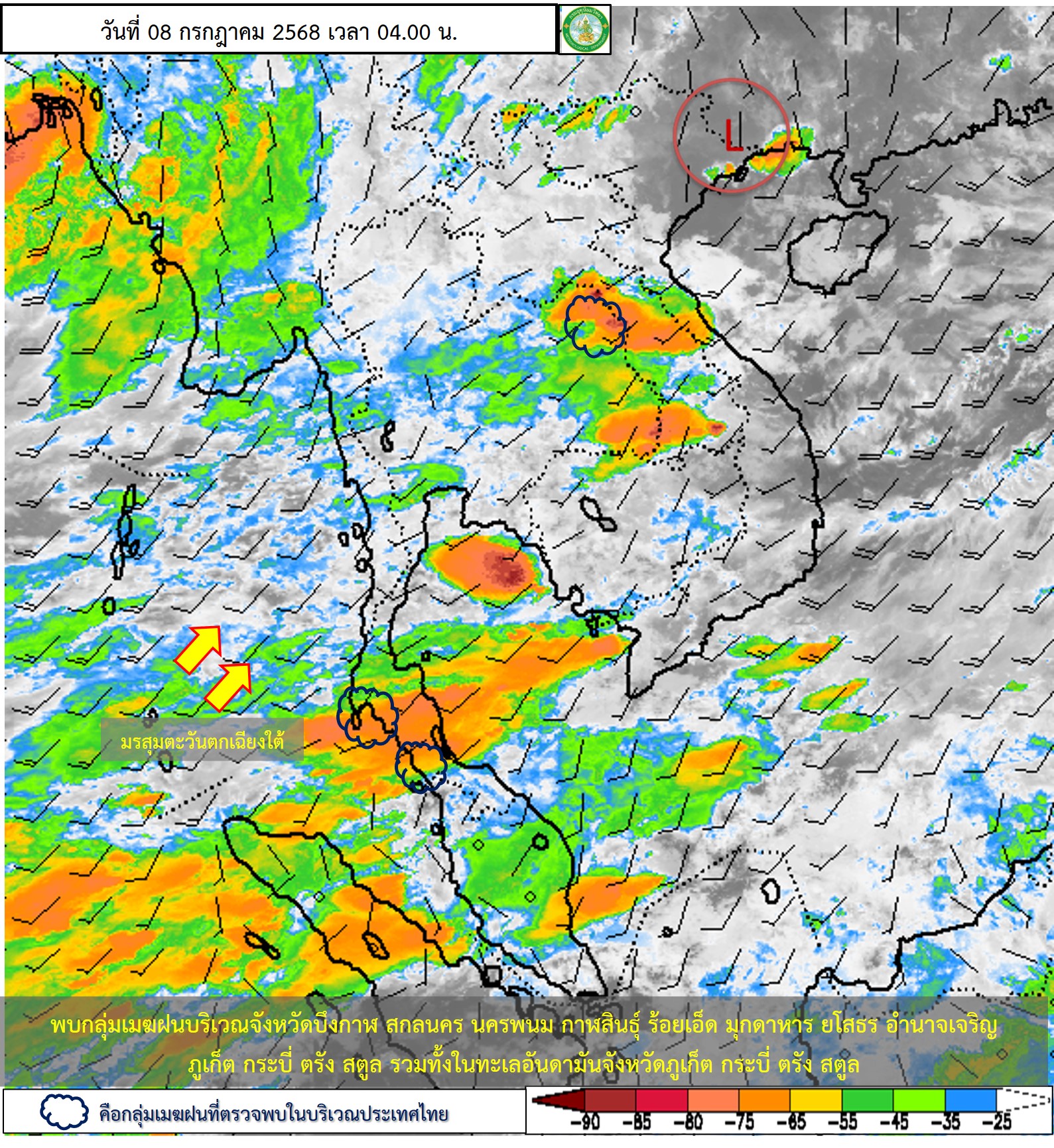 อนึ่ง พายุโซนร้อน “ดานัส” บริเวณทิศเหนือของเกาะไต้หวัน มีแนวโน้มจะเคลื่อนขึ้นฝั่งด้านตะวันออกของประเทศจีนในช่วงวันที่ 8–9 กรกฎาคม 2568 และคาดว่าพายุนี้จะอ่อนกำลังลงเป็นพายุดีเปรสชัน และหย่อมความกดอากาศต่ำกำลังแรงในระยะต่อไป โดยพายุนี้ไม่เคลื่อนเข้าสู่ประเทศไทย และไม่ส่งผลกระทบโดยตรงต่อลักษณะอากาศของประเทศไทย แต่จะทำให้มรสุมตะวันตกเฉียงใต้ที่ปกคลุมประเทศไทยมีกำลังแรงขึ้น